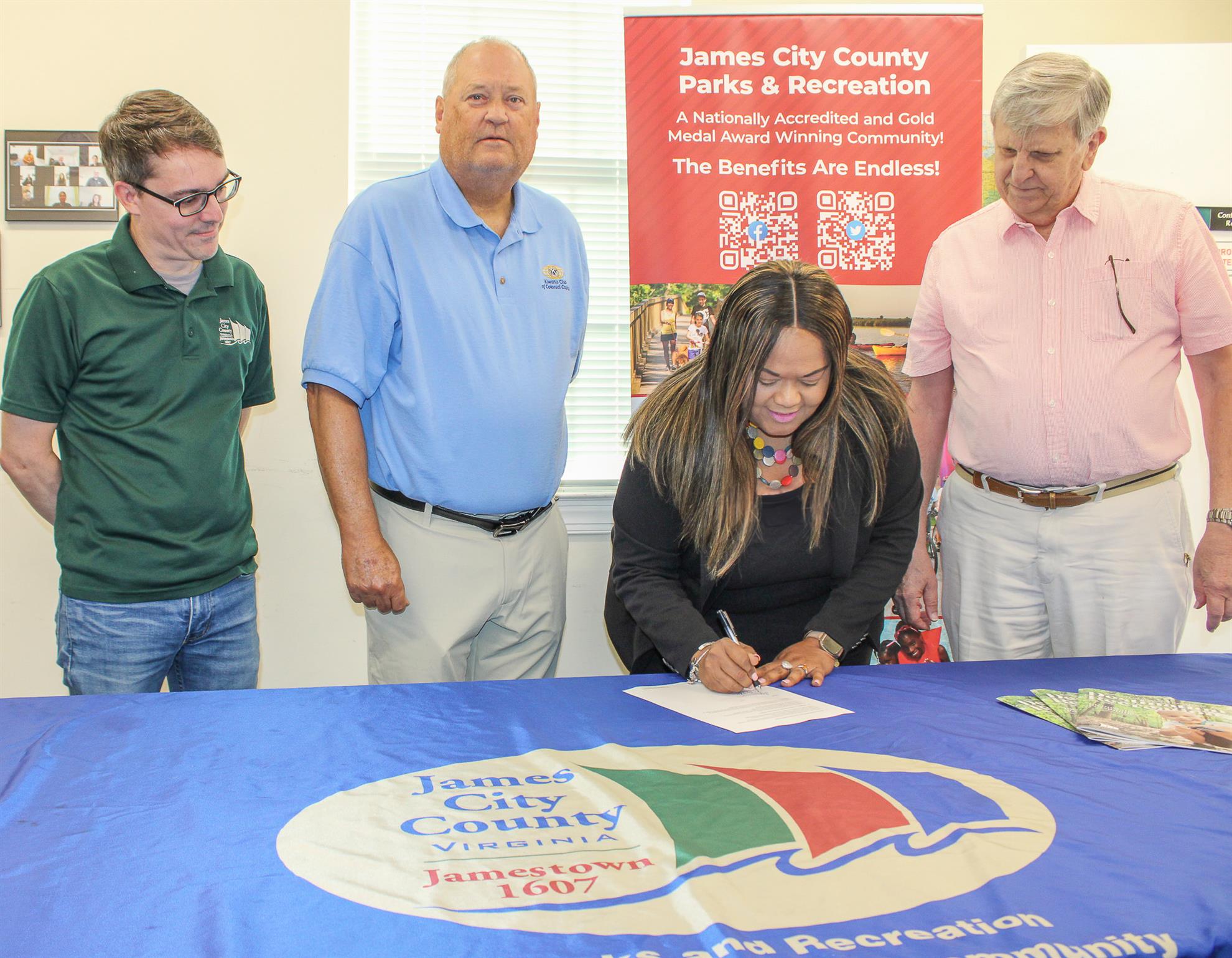 Pictured above are Alister Parkinson, Assistant Director of James City County's Department of Parks and Recreation, Clark Childers, 2025 KCCC Past President, Arlana Fauntleroy, Director of James City County's Department of Parks and Recreation, and Carl Stein, KCCC's 2025 President. Arlana is signing the Letter of Intent.